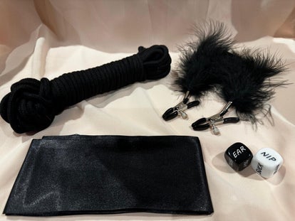 Black Erotic Role Play Kit - Black Blindfold, Nipple Clamps, Rope & Dice Set for Couples (18+)